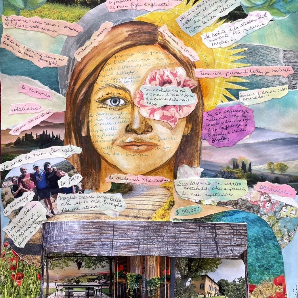 In Vision Board Self-Portrait SELF-PACED, ASYNCHRONOUS class we'll create a mixed media collage with drawing, painting, writing, and gluing words and images.