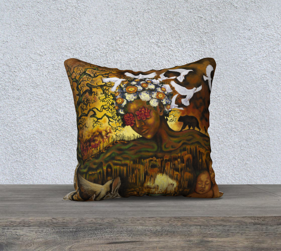 CUEVA is the ninth oil painting in my Mother Earth Series, about our relationship with the Earth. In this painting the Earth protects all living creatures from destruction. She gazes at them with eyes covered with Impatien flowers, symbols of motherly love. The white roses in her hair symbolize grace as they turn into doves, the loyal messengers of hope. The cave in the center of her being, represents the center of the Earth and ourselves. The place where the spirit and the fire of life begins.